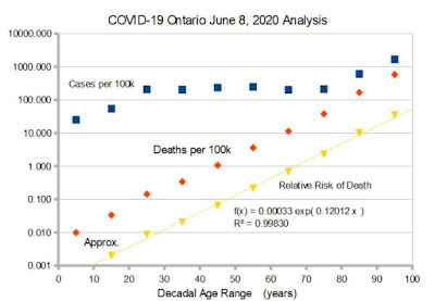 I continued to track the Ontario COVID-19 numbers to see how the results would change over time. A month after the above plot I redid the analysis and got the following graphs. As you can see, they are very similar. The number of cases and deaths per 100,000 people has gone up slightly as you would expect, but the overall shapes have remained the same. There was one death of a child under ten, which skews the bottom end in a non-statistically relevant way. For the "relative risk of death" curve (green triangles in this graph), between ages 20 and 95, the results are almost identical, fitting the same exponential equation as a month earlier. The doubling time for the death risk is also almost identical at 5.85 years. Since July there have been fewer new cases to add and even fewer deaths in Ontario, so the results are essentially unchanged as of this writing.